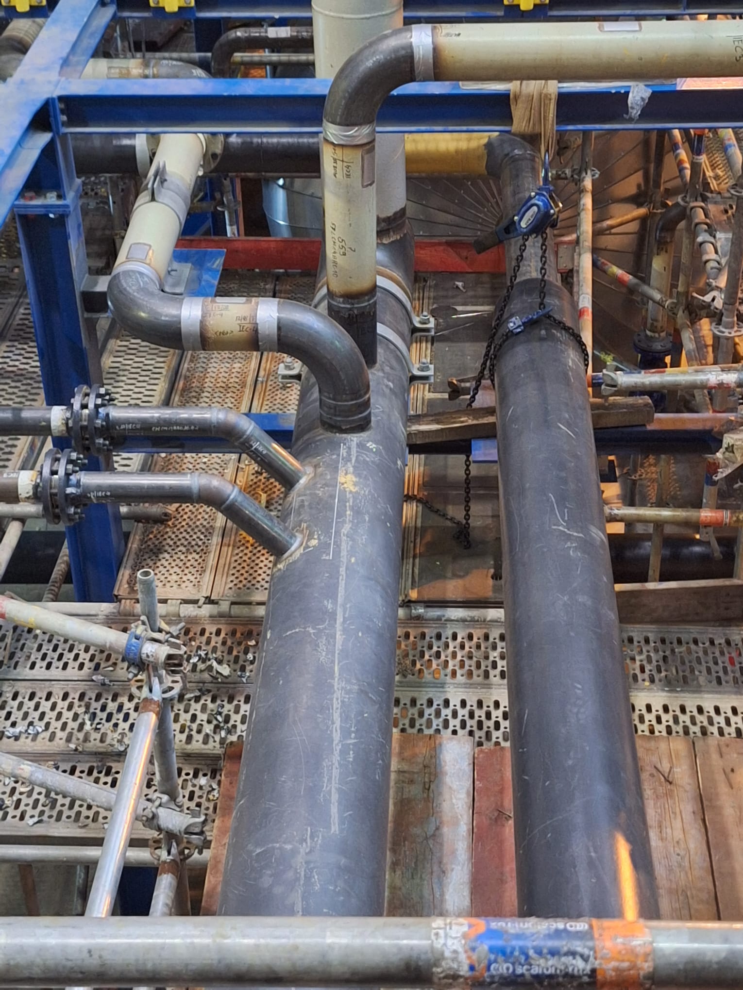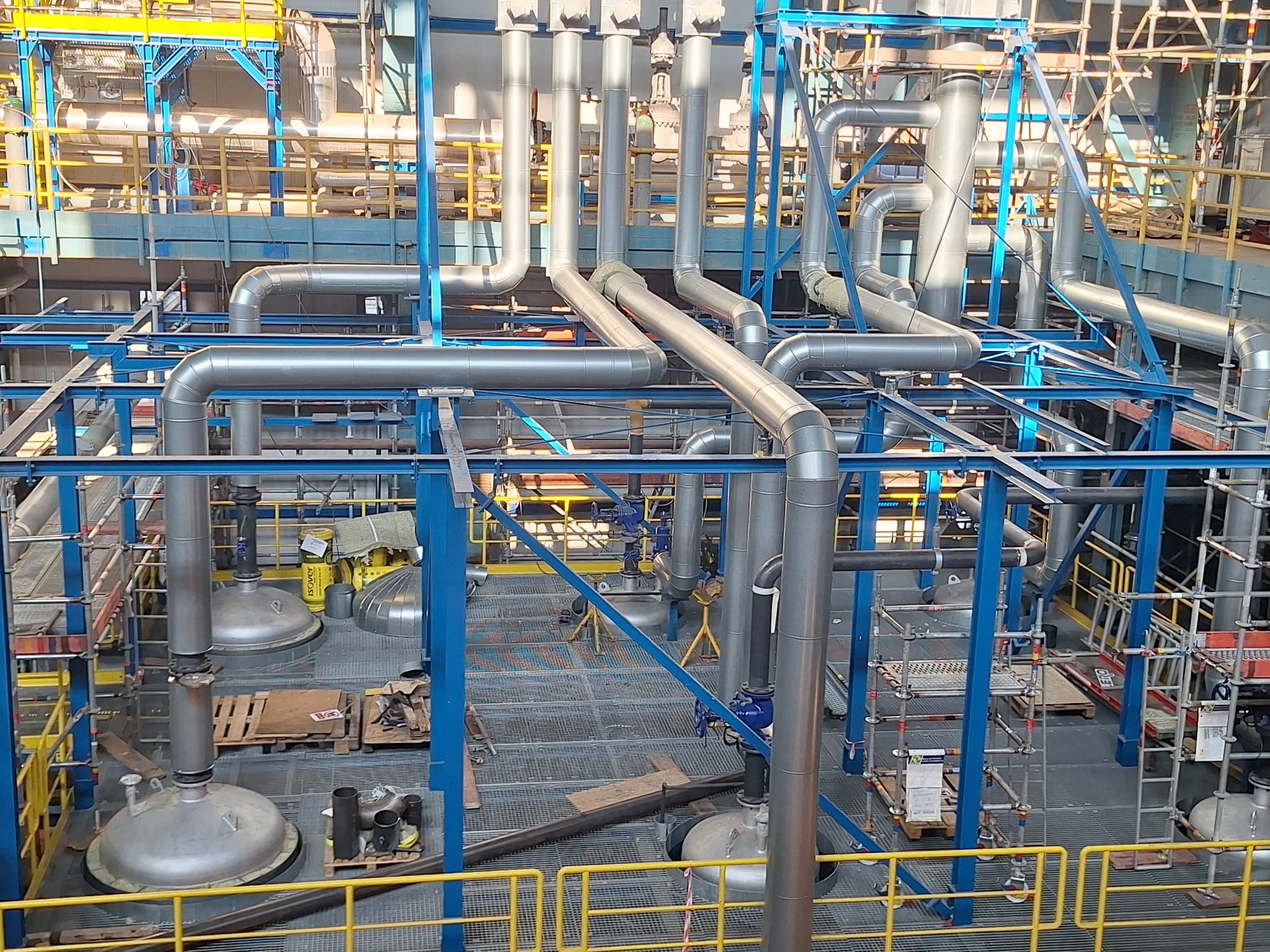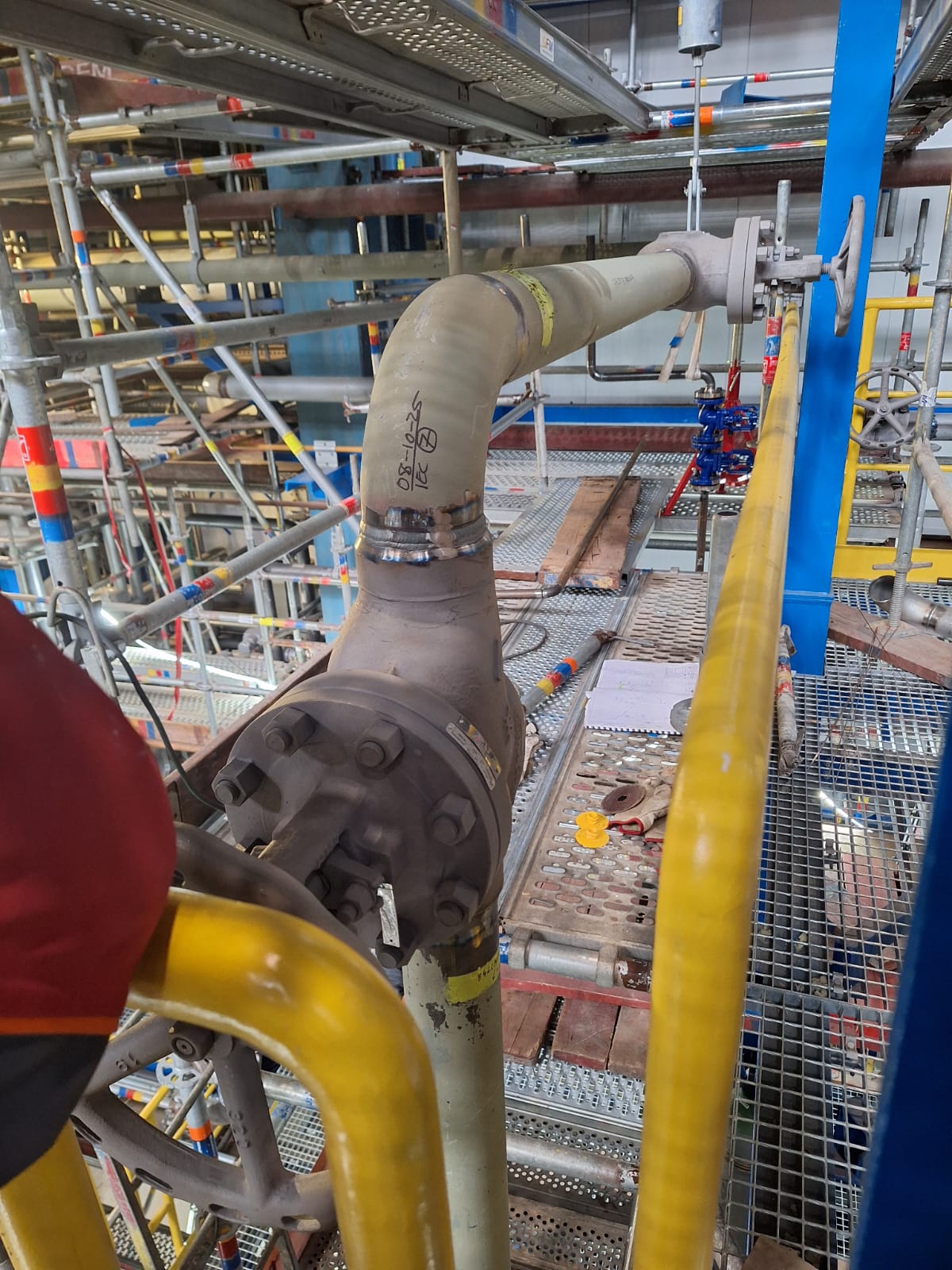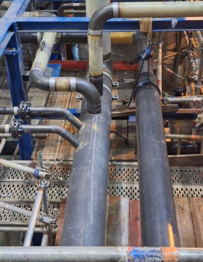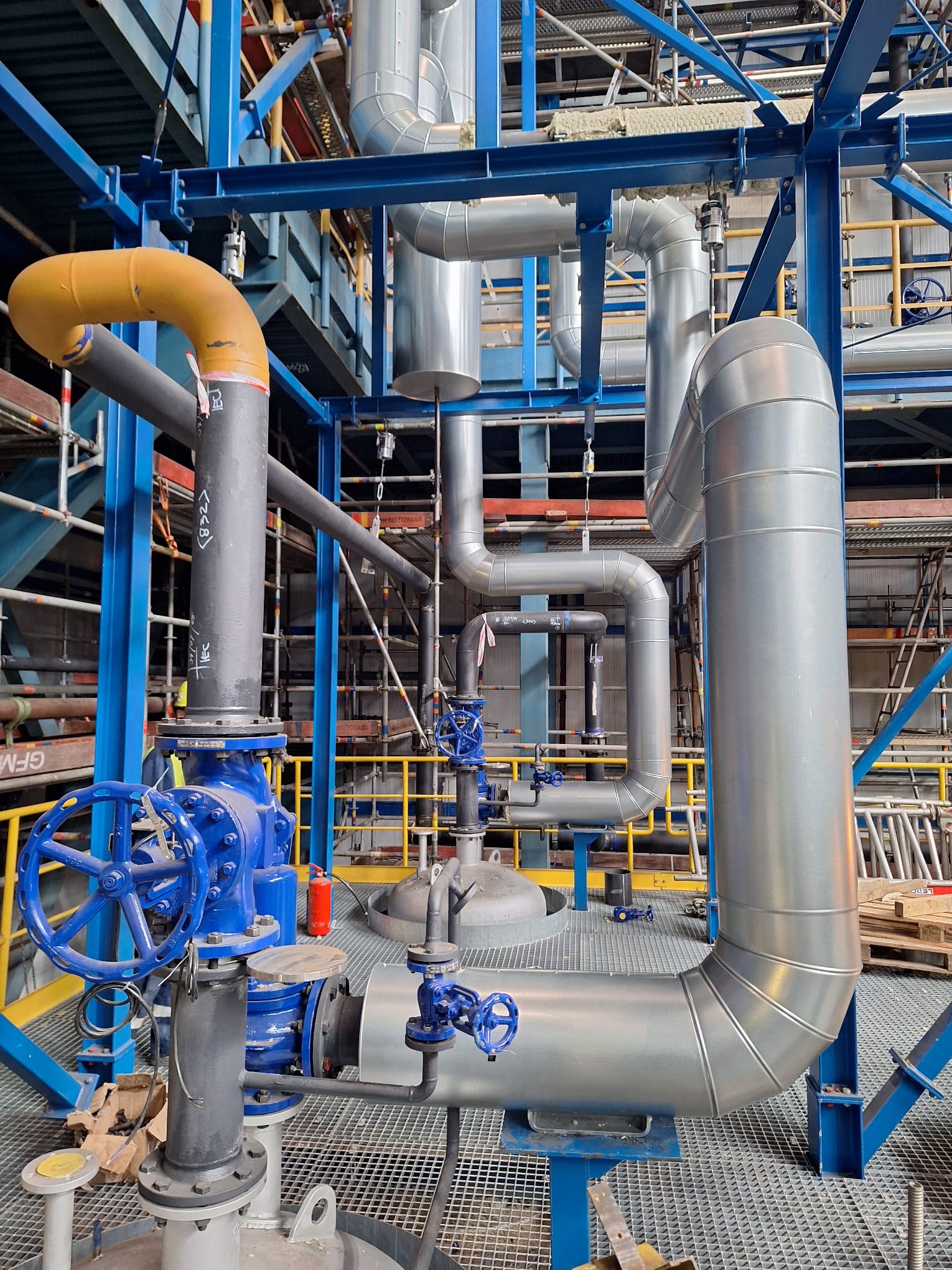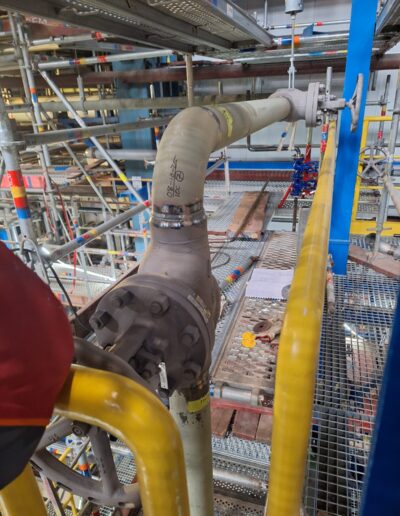 Zakres prac obejmował wykonanie rurociągów ze stali czarnej, stali nierdzewnej 316L oraz stali stopowej 16Mo3, przeznaczonych do pracy w podwyższonych parametrach ciśnieniowo-temperaturowych. Realizacja wymagała zachowania najwyższych standardów jakościowych, zgodności z dokumentacją techniczną oraz rygorystycznych norm obowiązujących w przemyśle chemicznym i energetycznym.
