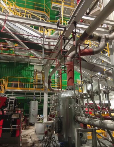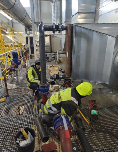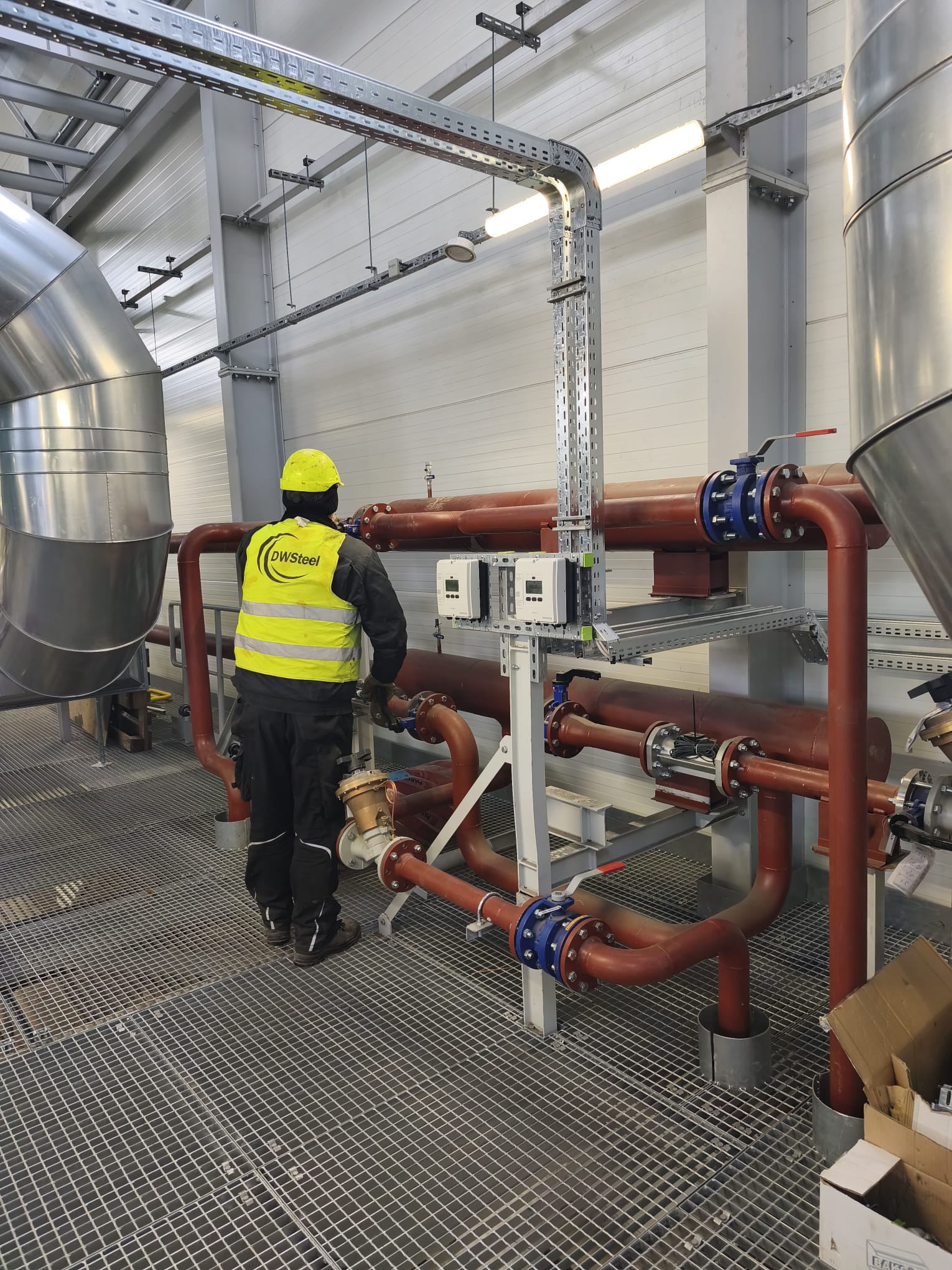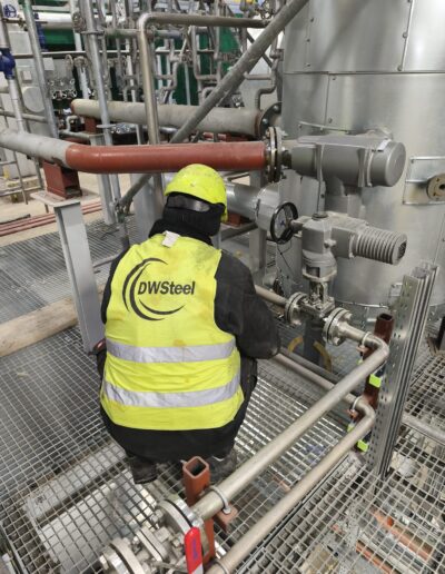 Firma DWSteel sp. z o.o. zrealizowała kompleksowe prace monterskie oraz spawalnicze w ramach budowy układu bloku parowego. Zakres zadania obejmował montaż i spawanie rurociągów technologicznych ze stali 16Mo3 oraz stali węglowej (czarnej) w zakresie średnic DN15–DN250, a także wykonanie i montaż konstrukcji wsporczych pod instalacje procesowe.